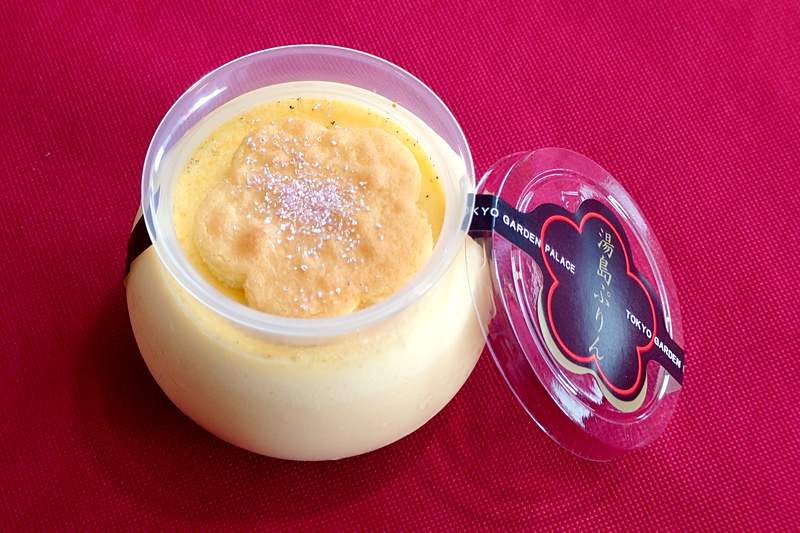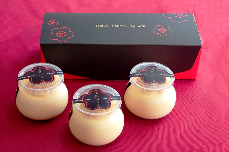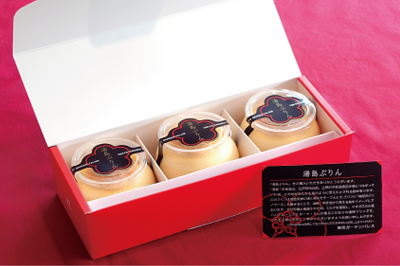 このプリンは湯島天神に咲く梅をモチーフとして、プリンに「梅型のジェノワーズ」をのせることで、当時、不忍池から見える島をイメージしております。
