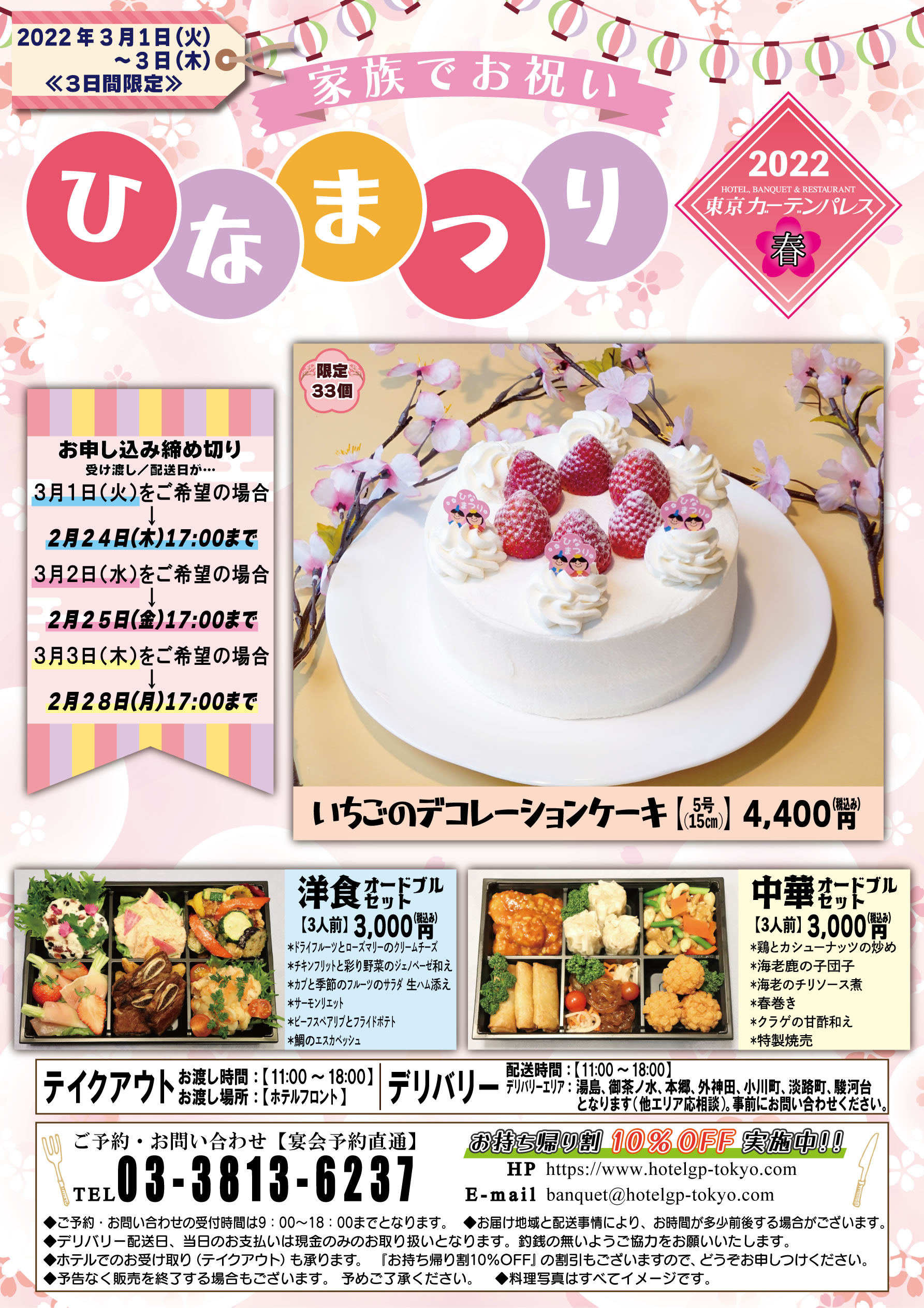 苺たっぷり、贅沢なひなまつりケーキを期間数量限定で販売いたします。地域限定でデリバリー♪もしくは、ホテル来館のテイクアウトでご利用いただけます。