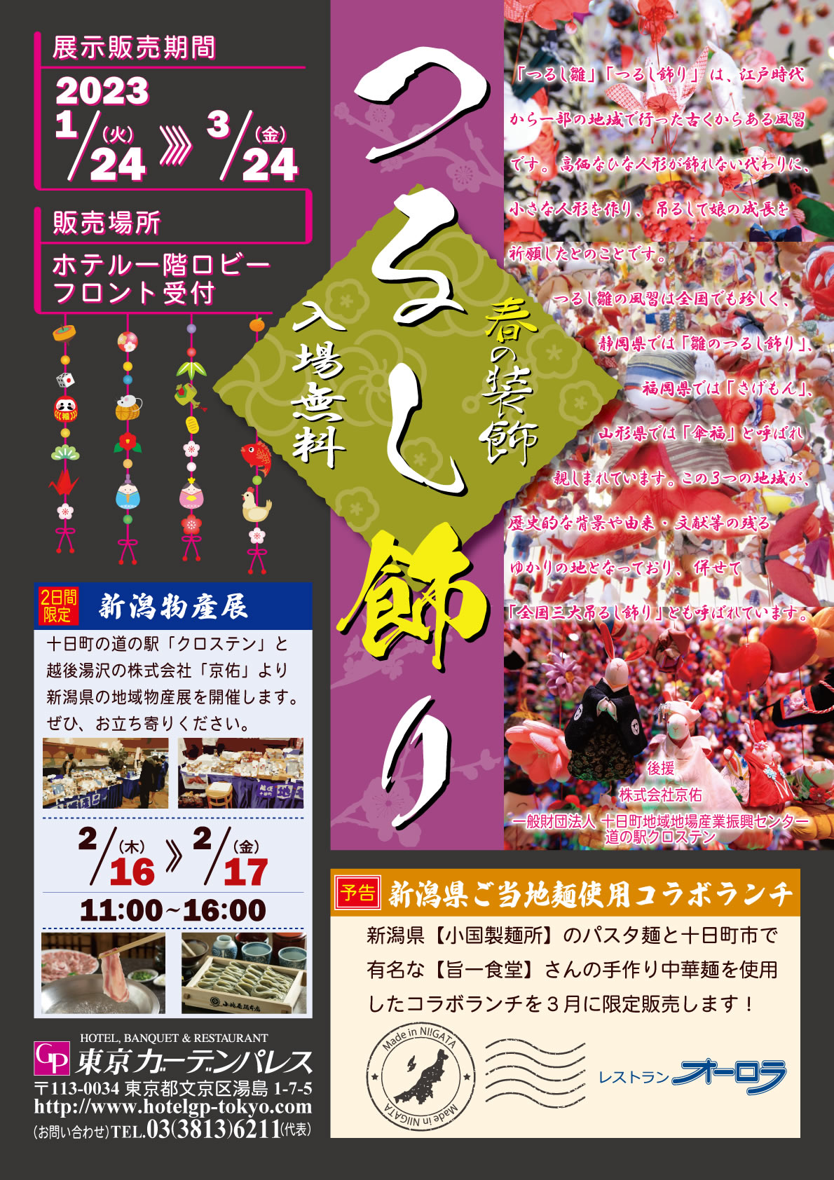 開催期間中は「つるし雛」(雪国越後 三大つるし雛)のミニチュア3基をホテル館内に展示いたします。