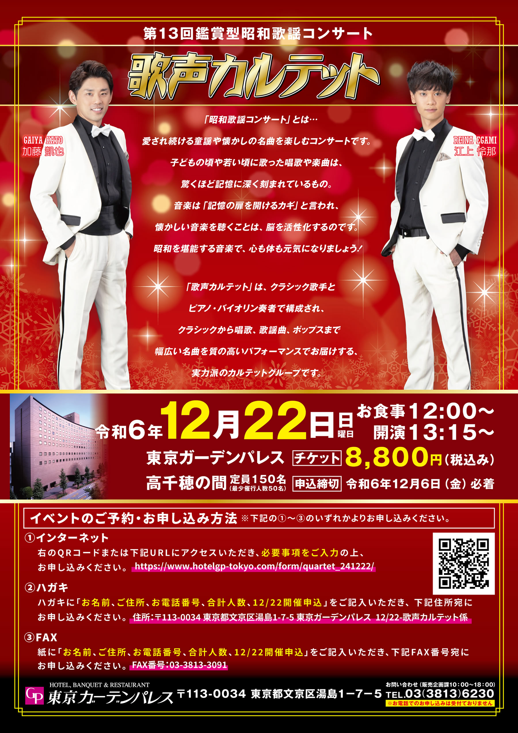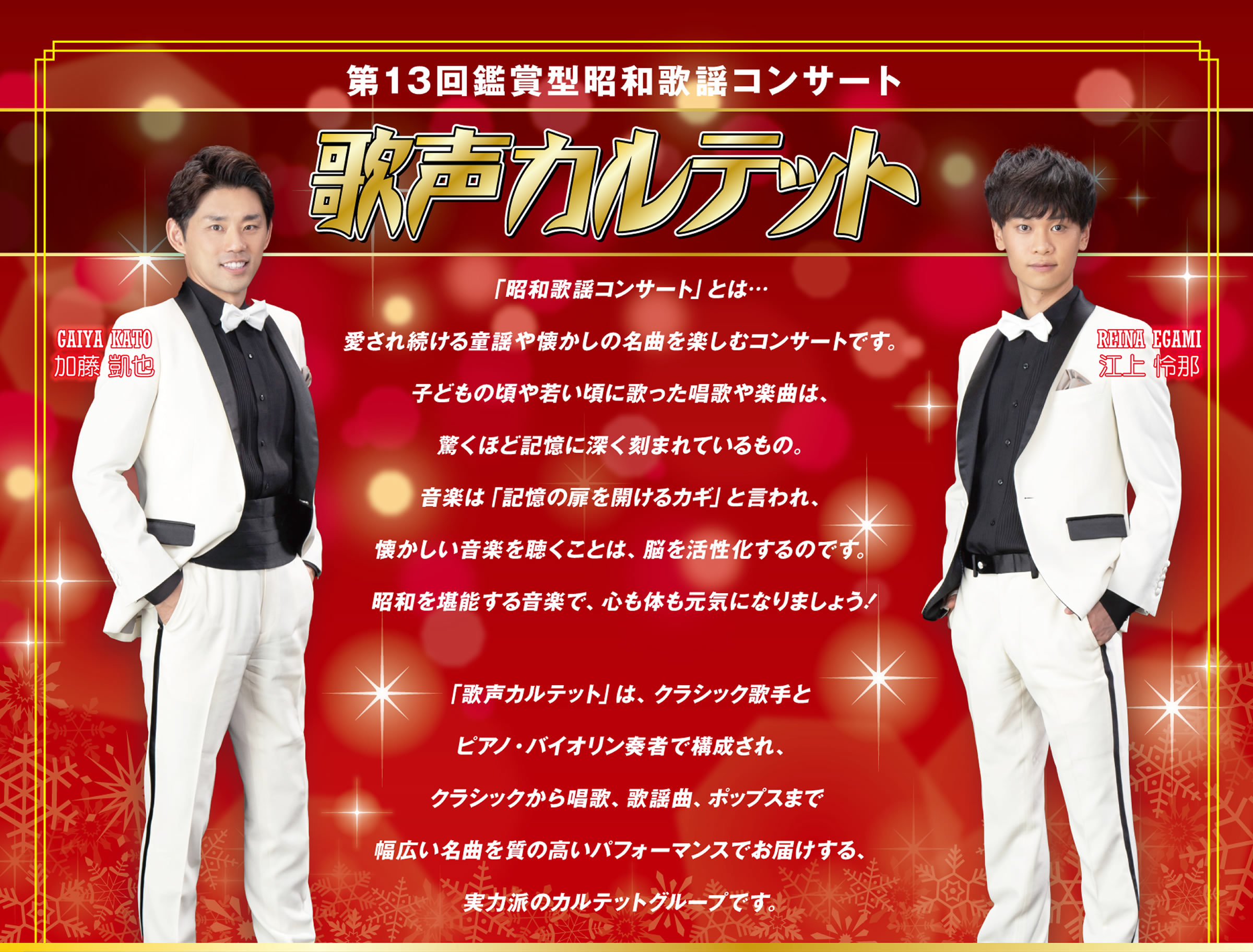 12月22日開催 第13回 鑑賞型昭和歌謡コンサート【歌声カルテット】ですが満席となりましたので、お申し込みを終了いたします。