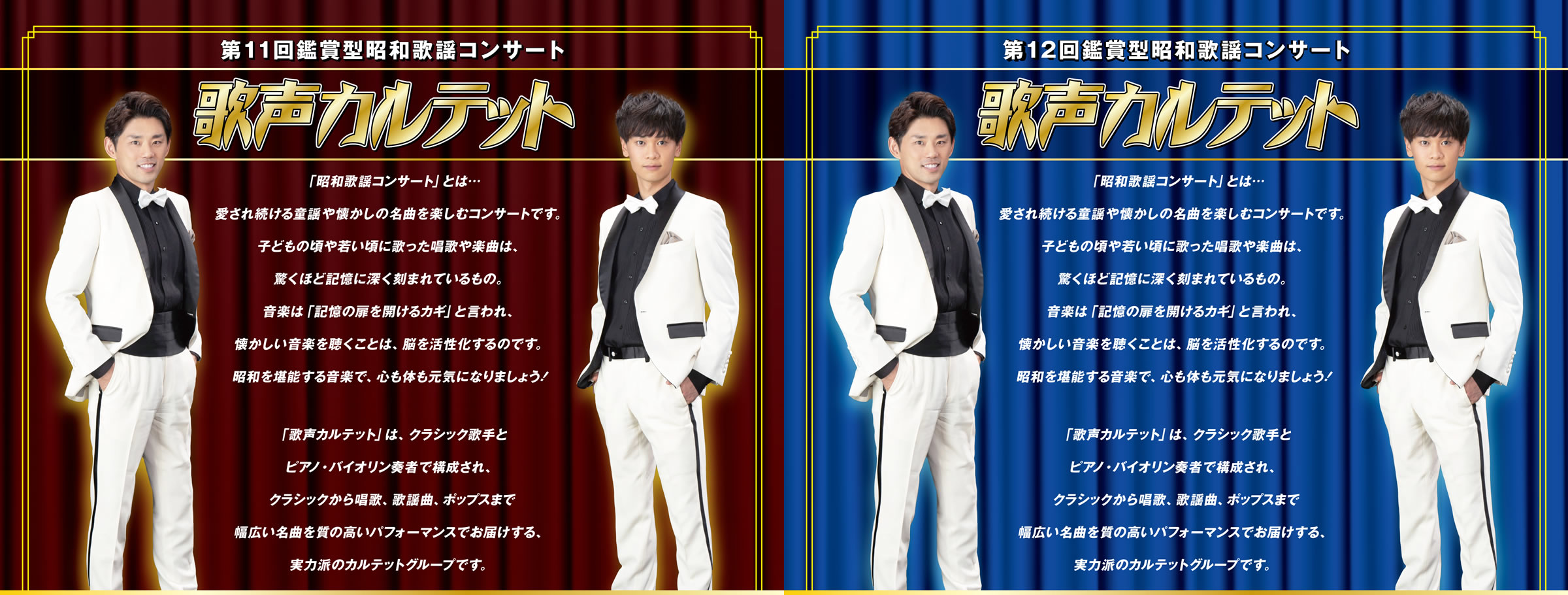 令和6年9月29日(日)開催 鑑賞型昭和歌謡コンサート【第11回 歌声カルテット】、並びに令和6年11月4日(月・祝)開催 鑑賞型昭和歌謡コンサート【第12回 歌声カルテット】は申込定員に達しましたため受付を終了させていただきました。