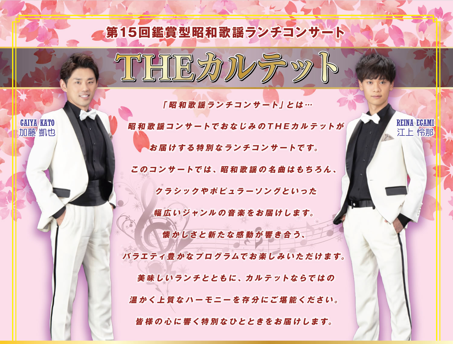 4月13日開催 第15回鑑賞型昭和歌謡ランチコンサート【THEカルテット】ですが満席となりましたので、お申し込みを終了いたします。