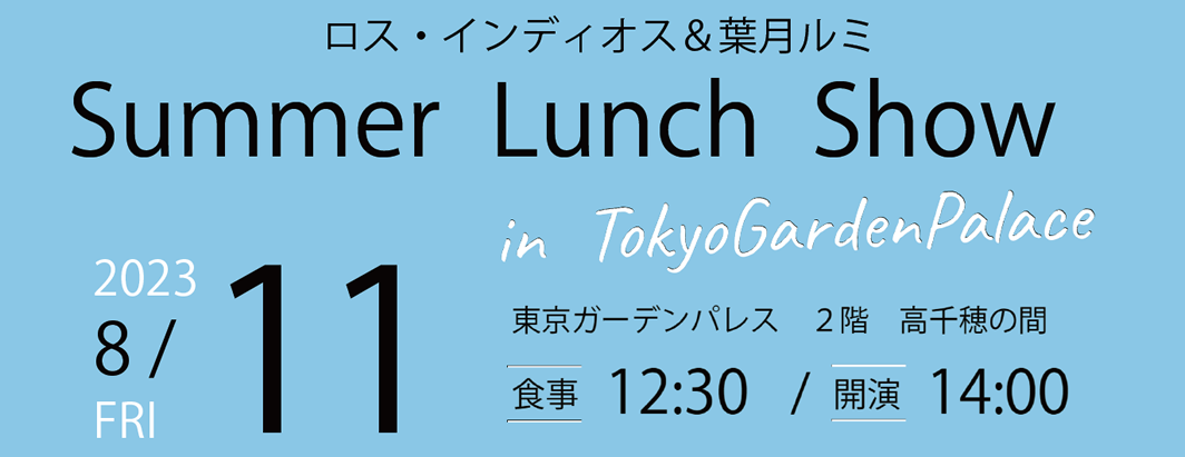 8月11日(金・祝)開催SUMMER LUNCH SHOWin TokyoGardenPalaceロス・インディオス&葉月ルミは、好評につき定員に達したため、お申し込みの受付を終了いたしました。多数のお申し込み、誠にありがとうございました。みなさまのご来場、心よりお待ちしております。