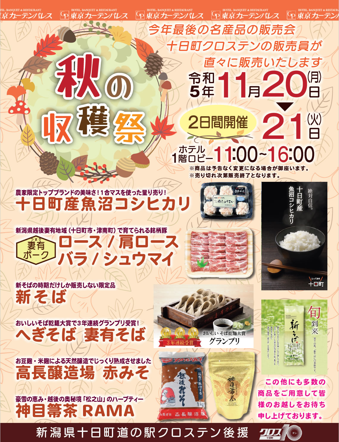 今年最後の地域特産品の販売会!新潟県より名産品を直送!秋の収穫祭としてご用意する販売商品は盛りだくさん♪毎年大好評の十日町産魚沼コシヒカリを1合マスで量り売り♪鍋に、焼いてもおいしい名柄豚の妻有ポーク!おいしいそば乾麺大賞で3年連続グランプリの妻有そば♪また、前回11月2日に完売した“おけさ柿”と“新興梨”も再販売します!是非、この機会にお買い求めください。