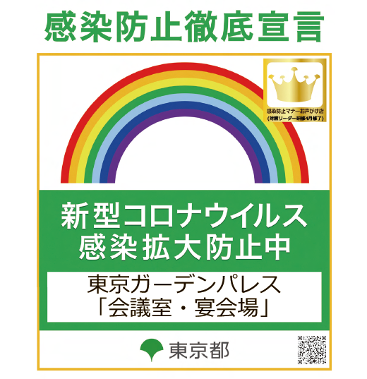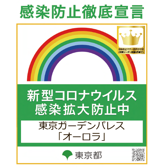 東京都の感染拡大防止対策の取り組み、感染防止マナーお声がけ店として当館、レストランオーロラ、会議室・宴会場の【コロナ対策リーダー研修】を修了した事をお知らせします。どうぞ、安心してご利用くださいますようお願い申し上げます。