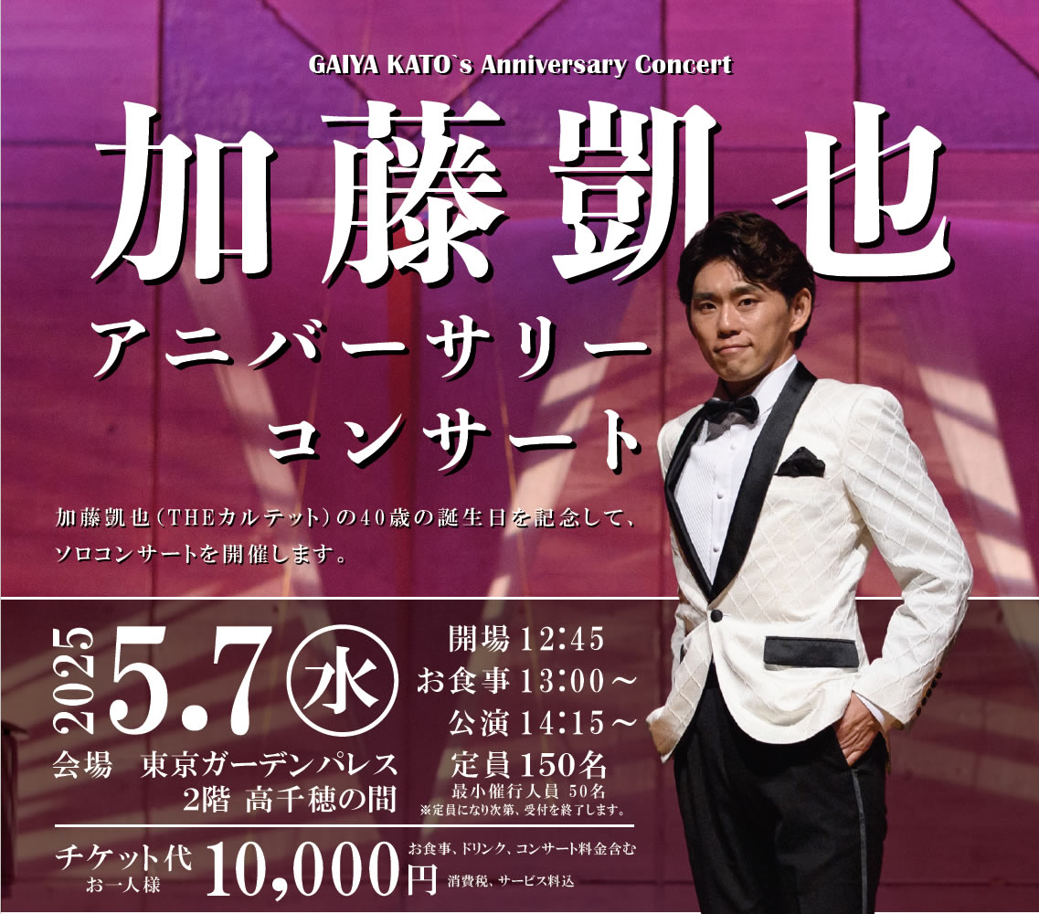 加藤凱也(THEカルテット)の40歳の誕生日を記念して、ソロコンサートの開催が決定しました!