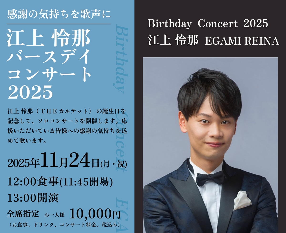 11月24日開催 令和7年11月24日(月・祝)開催【江上怜耶バースデイコンサート】ですが満席となりましたので、お申し込みを終了いたします。