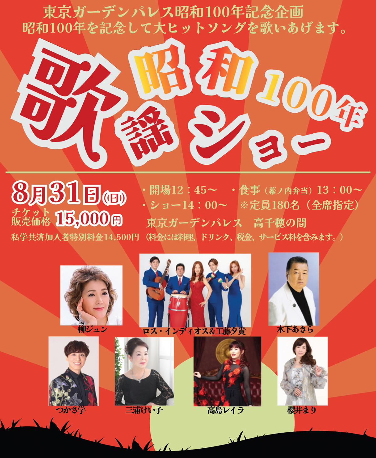 8月31日(日) 東京ガーデンパレス「昭和100年歌謡ショー」ですが満席となりましたので、お申し込みを終了いたします。