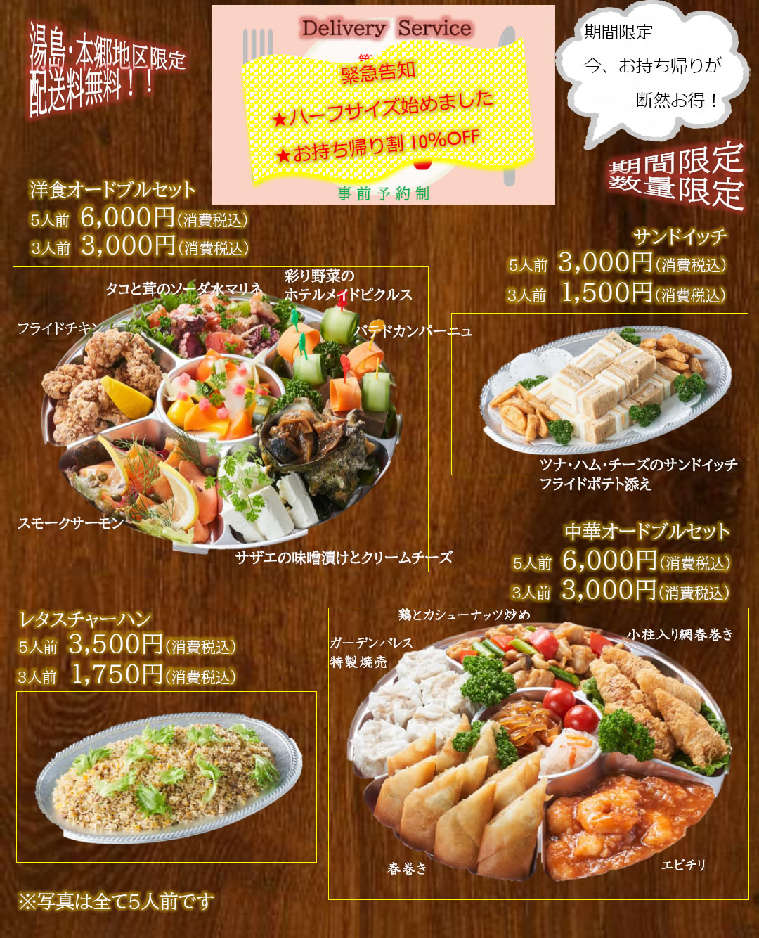 ホテル厨房で作る「安心・安全・美味しい」を湯島・本郷地区のお客様に配送料無料で配達いたします。