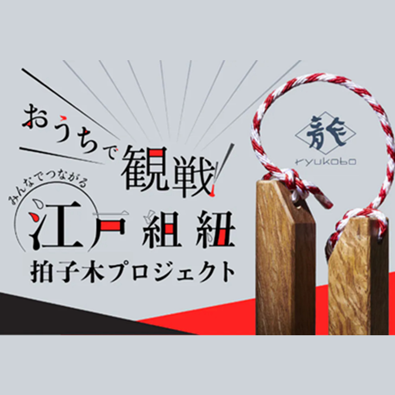 長年 人と人、人と大事なモノを繋げてきた ‘組紐’という伝統工芸に携わってきた江戸組紐・龍工房が「共に頑張る、共に乗り越える」という気持ちをカタチにするために、組紐を用いた拍子木を作りました。この組紐を通して 仲間との‘つながり’を感じながら友達・仲間とオンライン観戦、また家族やパートナーと一緒にテレビで試合を見たり自分のチームを応援する時に ぜひ“拍子木”を鳴らしてお楽しみ頂き、またスポーツ観戦以外でも いつかコロナが落ち着いた時や オンライン飲み会などで仲間が集まった際など、是非いろいろなシーンにお使いいただけますと幸いです。