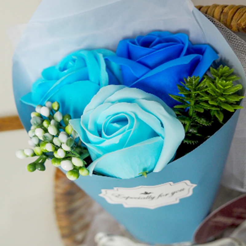 生花を特殊加工した、水やりのいらないプリザーブドフラワーを使った手づくりアイテムと花言葉は「夢かなう」青バラのソープブーケのセットです。