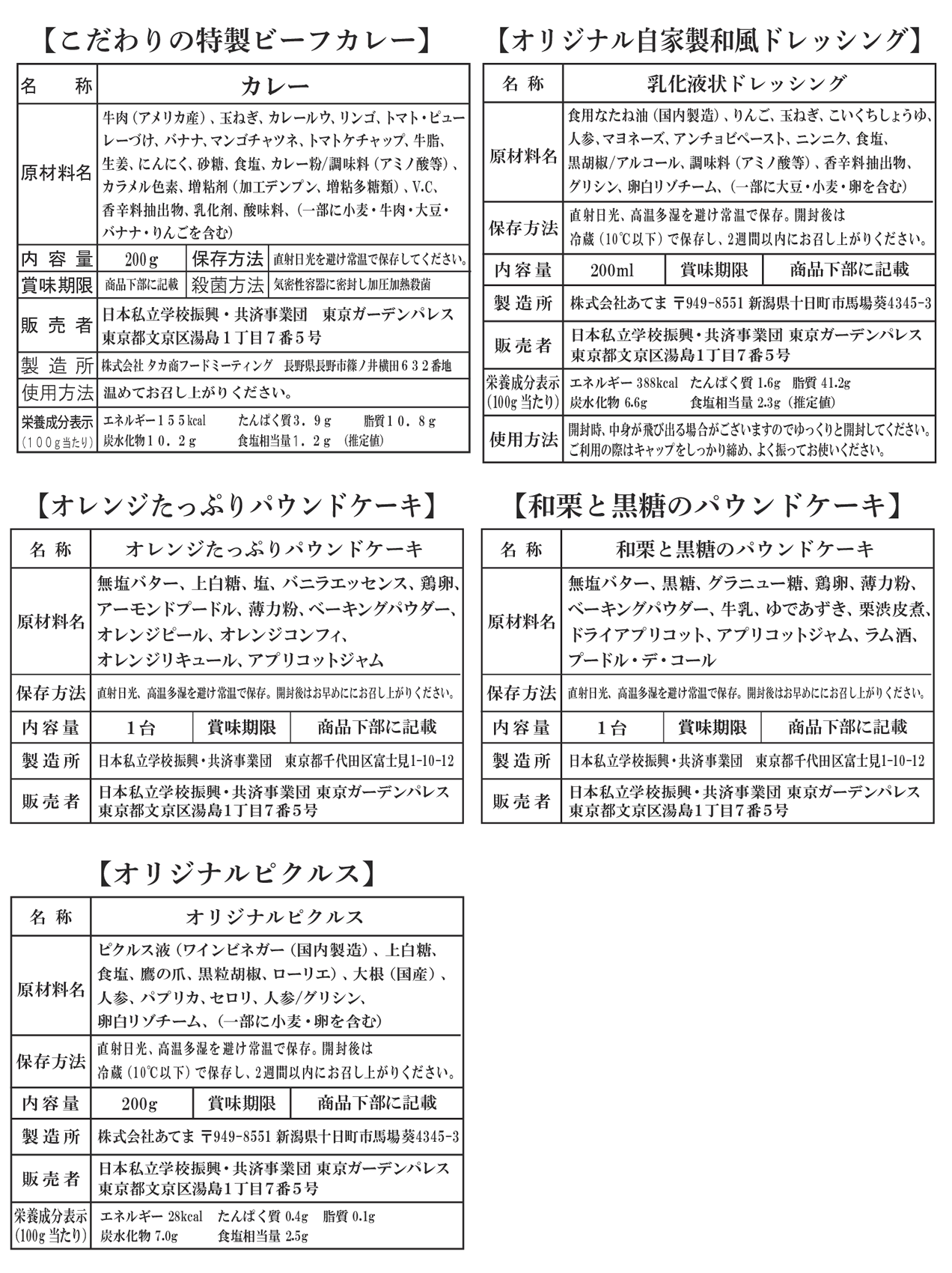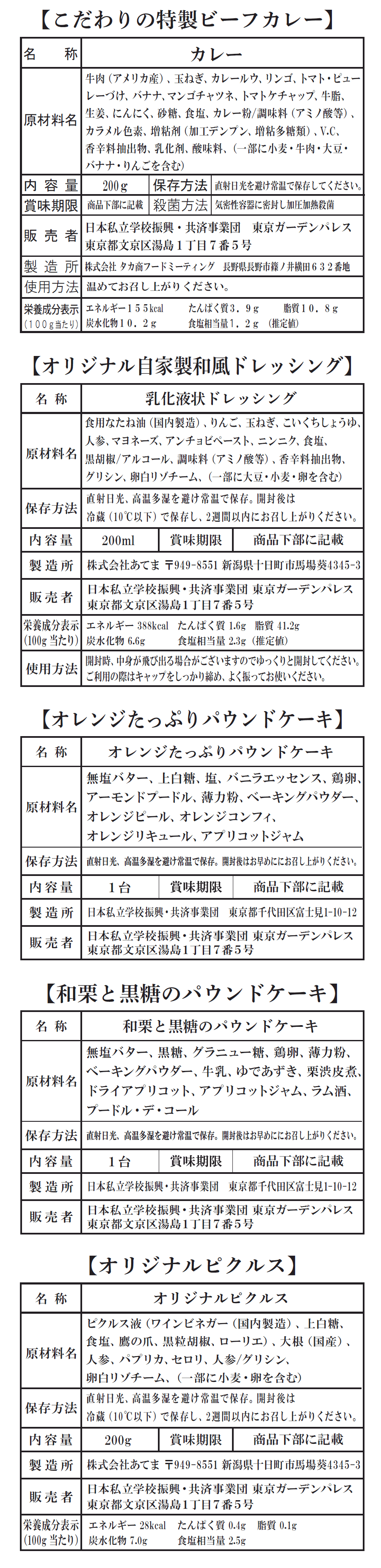【Bセット】~東京ガーデンパレス自慢の味~プライベート商品の5点セット