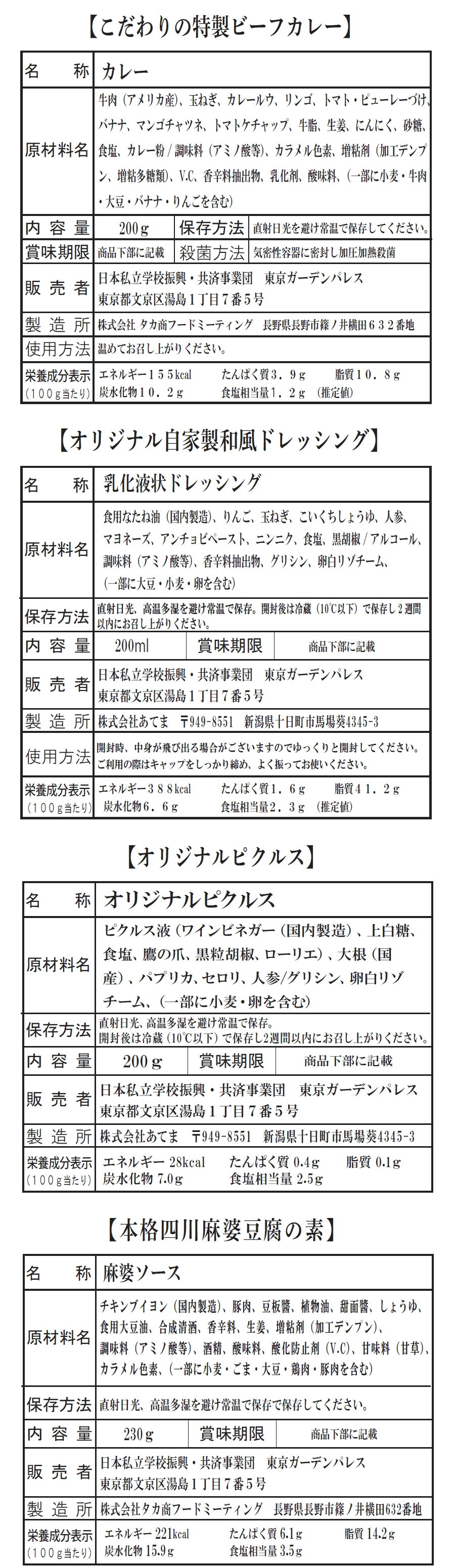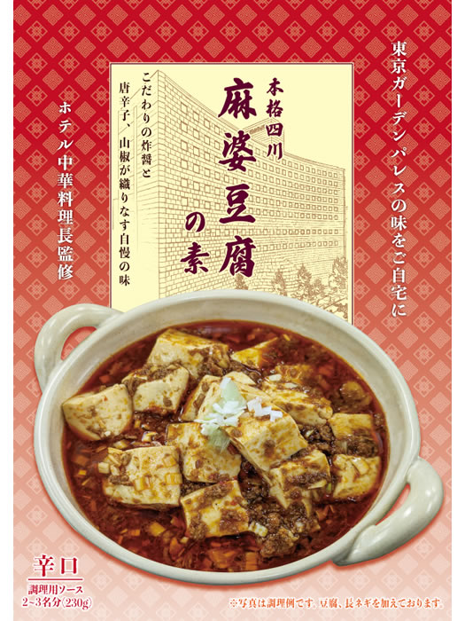 ホテルご利用のお客様より「自宅で食べたい」「お土産にしたい」など多くの声をいただきました東京ガーデンパレスプライベート商品≪特製ビーフカレー≫≪ピクルス≫≪レストラン自家製レッシング≫に新たに≪麻婆豆腐の素≫を商品化いたしました。東京ガーデンパレス自慢の味~厳選商品6点セットで販売いたします。ぜひ、ホテルの味をご家庭でお楽しみください。