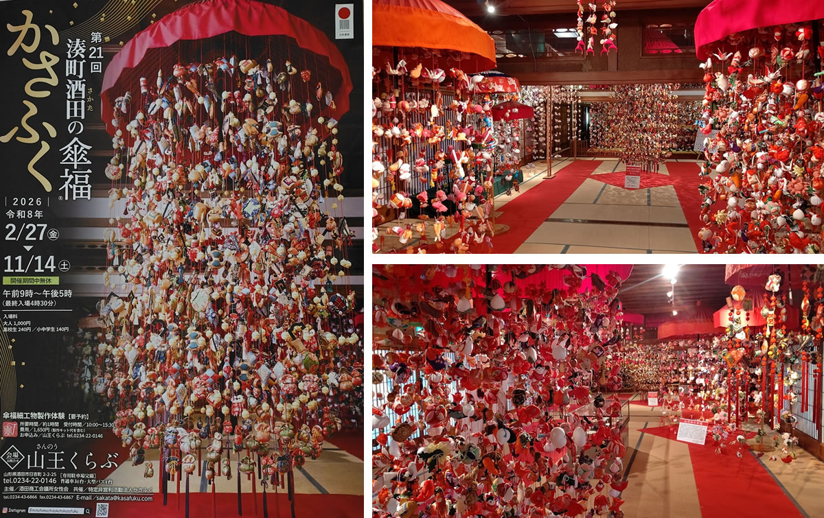 毎年2月下旬から11月上旬まで酒田市にある山王くらぶにて開催される「湊町酒田の傘福展」では圧巻の傘福展示が行われ毎年多くの見学客で賑わいをみせています。