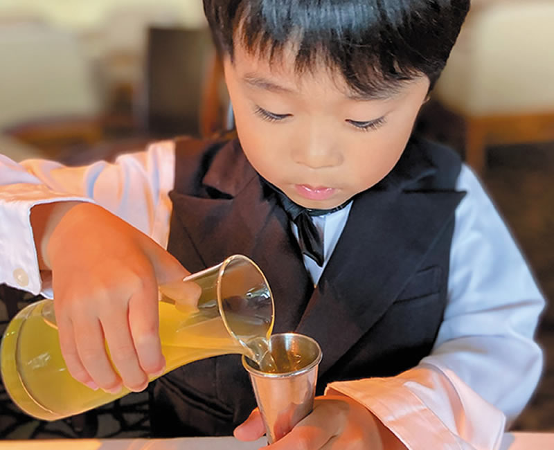 ちびっこバーテンダー体験!“モクテル”(ノンアルコールカクテル)作りをホテルスタッフが楽しく丁寧に教えます。でき上がったモクテルはどんな色や味がするかな?